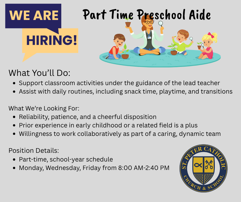The dedicated staff at St. Peter Catholic School embody the spirit of compassionate education, fostering an environment where each child's academic, spiritual and emotional growth is nurtured. Led by devoted teachers, administrators, and support personnel, the school community is characterized by unwavering commitment to excellence with their values rooted in our Catholic faith. With boundless patience and enthusiasm, our teachers not only impart knowledge but also emphasize moral principles and a sense of community responsibility. Beyond the classroom, their tireless efforts extend to creating a warm and inclusive atmosphere where every child feels valued and empowered to reach their fullest potential.